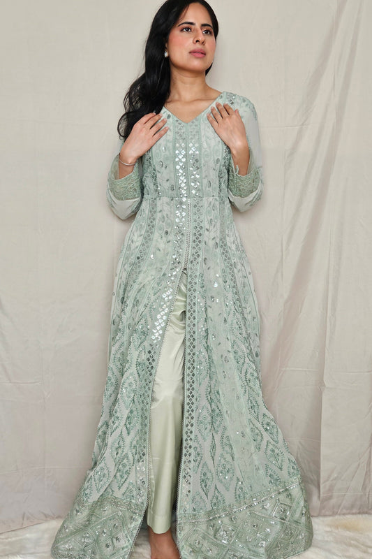 Pastel Sage Green Georgette Sequence Embroidered Anarkali with Slit Style