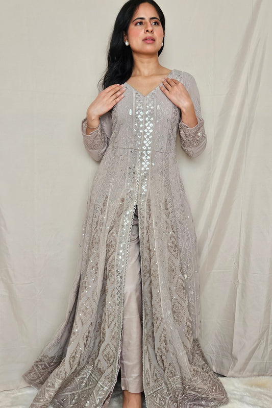 Taupe Brown Georgette Sequence Embroidered Anarkali Slit Style