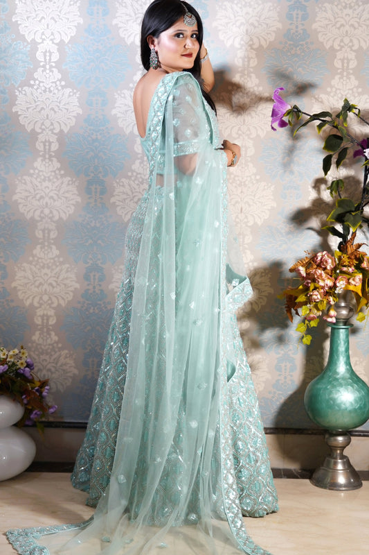 Teal Blue Embroidered Lehenga Set with Mirror Work & Sequins Detailing
