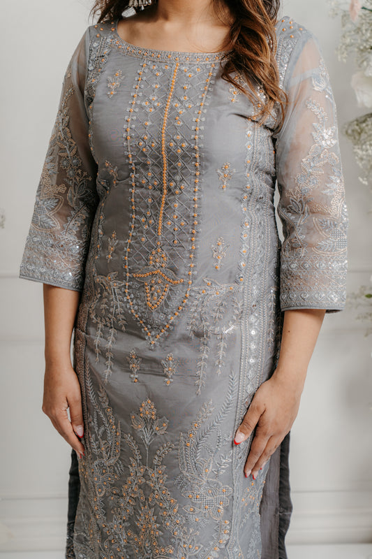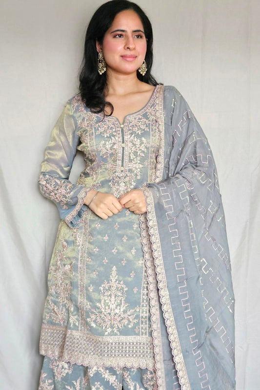 Blue & Grey Metallic Zari Embroidery Shimmer Organza Sharara