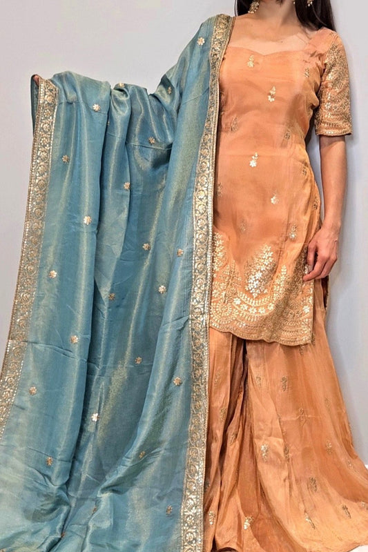 Peach & Teal Embroidered Sharara Set with Gold Detailing