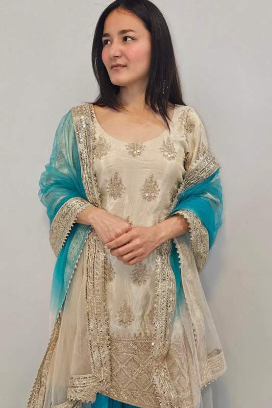 Teal Blue & Gold Embroidered Sharara Set
