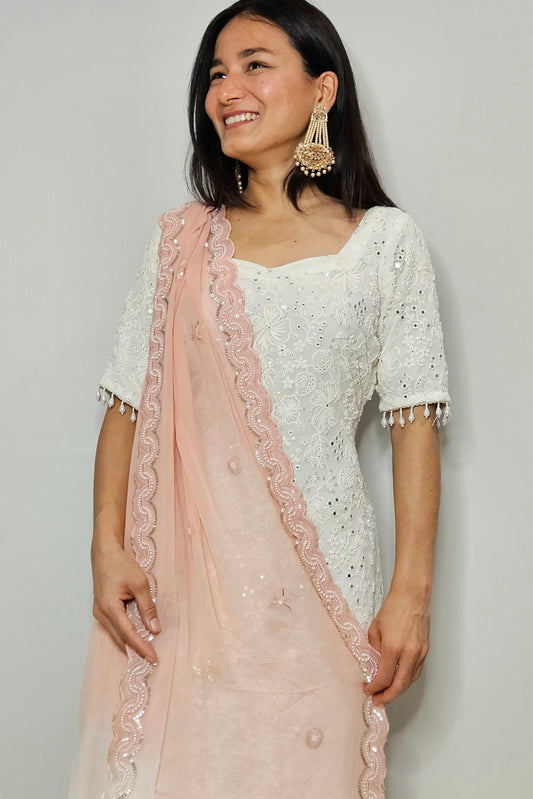 White & Peach Hand Embroidered Georgette Sharara Set